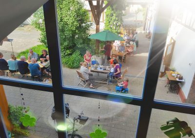 Der Hofladen soll mittelfristig ein zentraler Ort der Begegnung werden, an dem man verweilen und plaudern kann. Entsprechend wird auch schon jetzt an einem Tag in der Woche Kaffee und Kuchen angeboten. Jeden Samstag besteht die Möglichkeit vorbestellte Bio-Backwaren abzuholen.